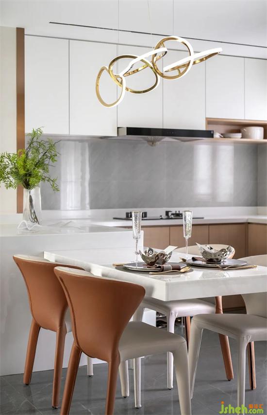 簡(jiǎn)靜的理石白餐桌,與雅致的皮質(zhì)棕餐椅,在極具當(dāng)代氣息的金屬線型燈光的映照下,平衡著餐廳純粹而高級(jí)的美學(xué)氛圍。樣板房設(shè)計(jì)與此同時(shí),灑進(jìn)室內(nèi)陽(yáng)光也如期而至,猶如一幅天然的背景畫(huà),為空間敘寫著此間情境的美感。