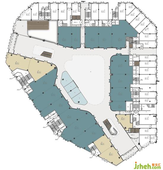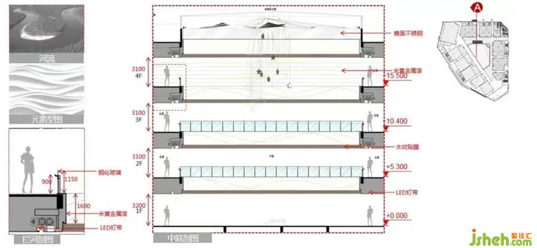 提出峽谷溪流的構(gòu)想,通過曲線條的穿插,與自然結(jié)合,呼應(yīng)本真與自我,攔河運用米黃色金屬漆和曲線的形態(tài)勾勒手法在空間里詮釋,地面運用幾種人造石的色帶,演繹河流的動感,在空間里起到引流的作用,在中庭處形成空間亮點。