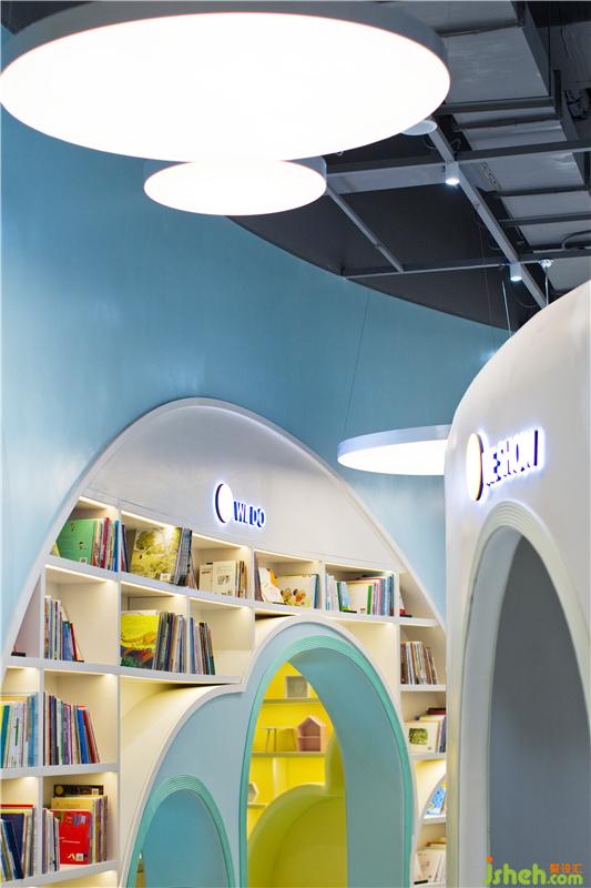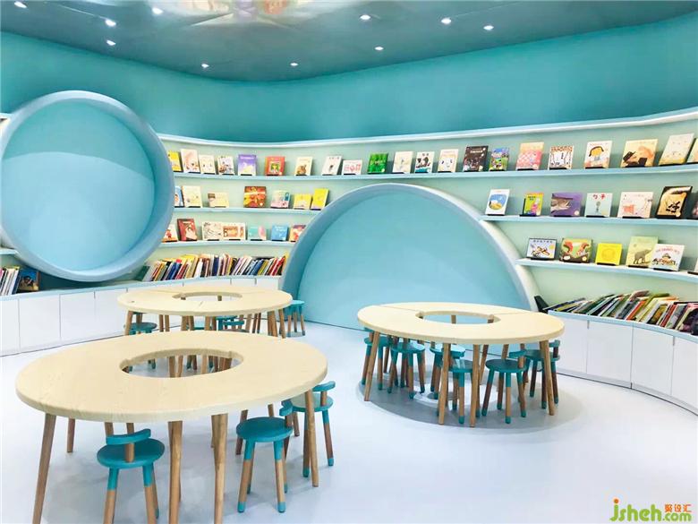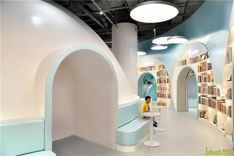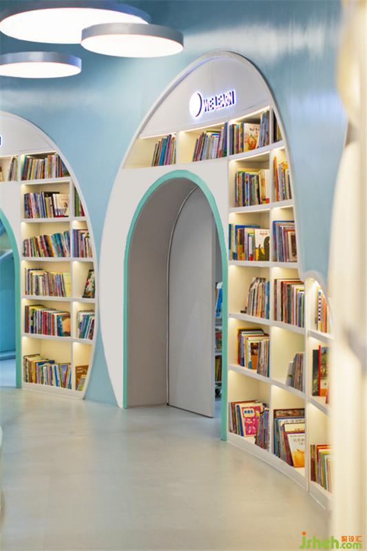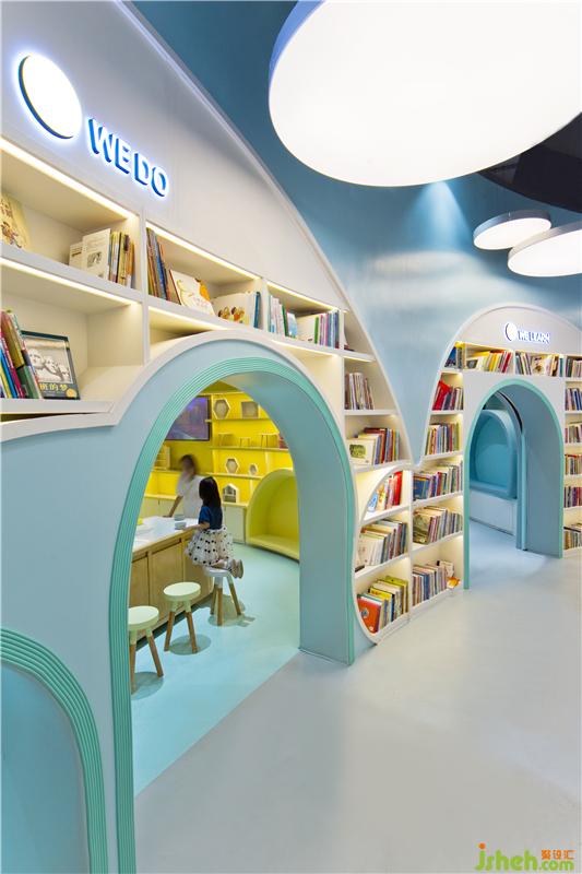 在第二個空間,圓頂沉浸式劇場設(shè)置了360度投映,家長和小朋友可以在內(nèi)一起感受多媒體互動學(xué)習(xí),聽講座,辦讀書會,并且還可供會員開展兒童生日派對。兒童書店設(shè)計圓頂劇場被多用途兒童教室和全日制親子餐廳包圍,為父母提供專門的休息區(qū)域可供交友,放松,談話等活動,除此之外,更是貼心地為大家準(zhǔn)備了烘焙教室,使得孩子可以和父母一起體驗烘焙的樂趣。其中采用明黃色和嬰兒藍的半開放式教室是為了讓孩子們放松心情,消除與教師之間緊張的相處模式,在良好舒適的環(huán)境中激發(fā)出他們的學(xué)習(xí)興趣。