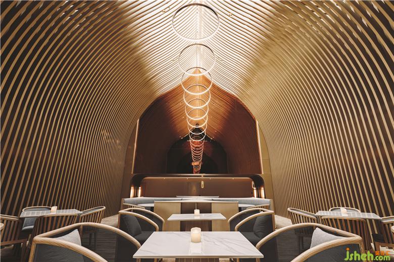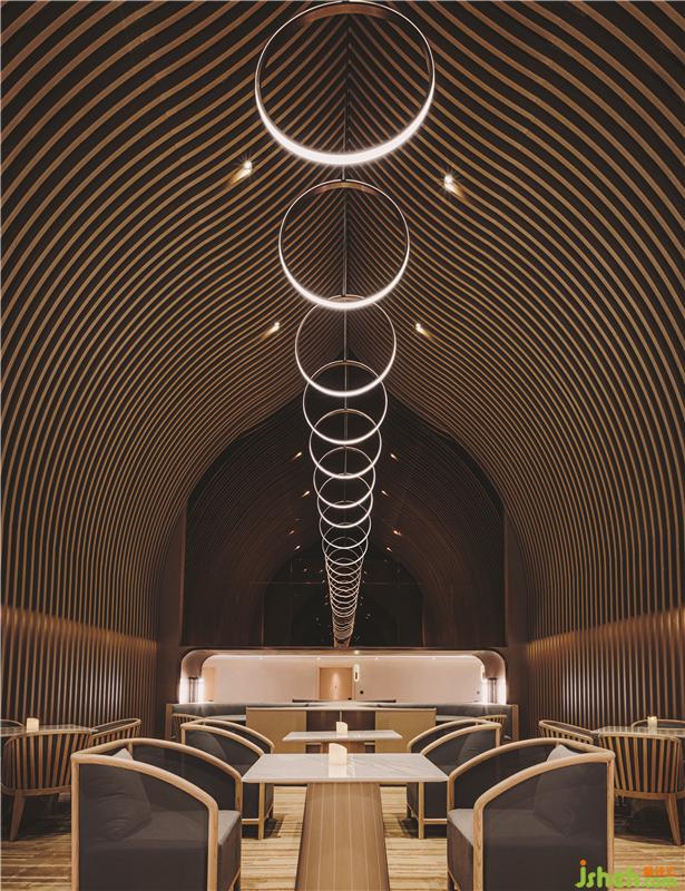 在頂樓的SkyCafé,全高的竹子結構構成了禪宗和教堂般的空間。上方的天窗可以讓白天的自然光落在座位區(qū)的中間。商務酒店設計吊頂懸掛的圓形LED燈形成無盡的發(fā)光月亮,并在夜間為客人提供詩意的體驗。