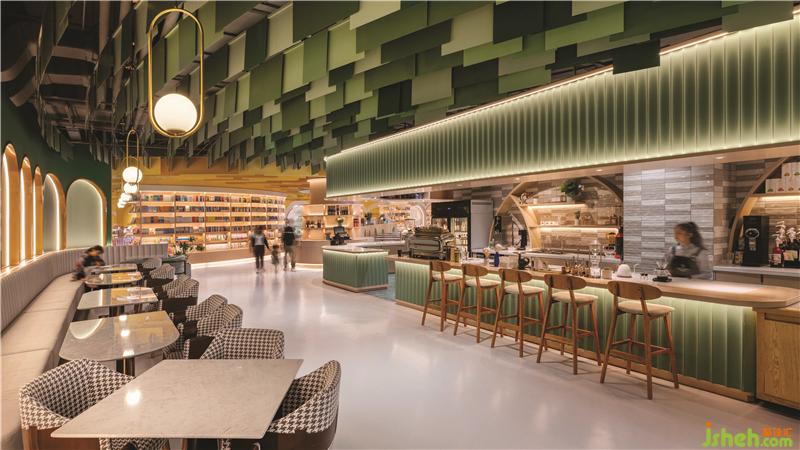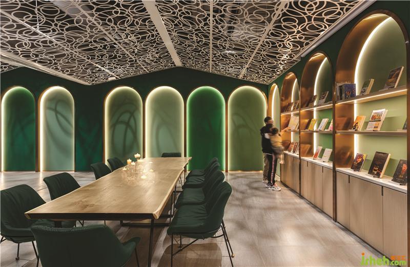 第三個(gè)區(qū)域是綠色調(diào)子的親子餐廳,由三個(gè)不同的功能區(qū)域組成:兒童書店設(shè)計(jì)橢圓劇場(chǎng)周圍的平臺(tái)用餐區(qū),開放式廚房對(duì)面的長椅就座區(qū)以及激光切割白色金屬板制成描繪花園洋房的形狀的VIP區(qū)。