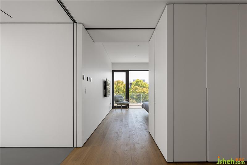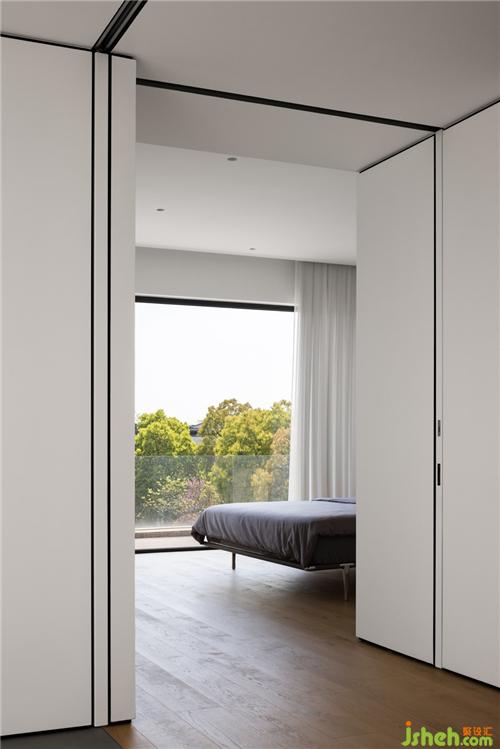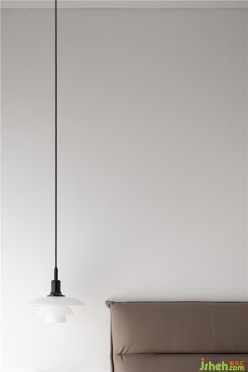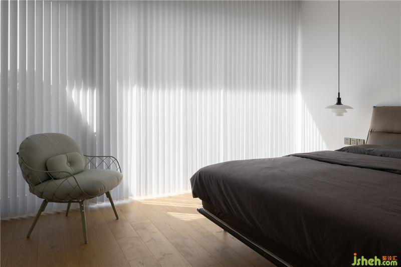 臥室寬大的床上擺放著舒適的床上用品,波浪條紋的窗簾隱隱約約透過(guò)光,設(shè)計(jì)簡(jiǎn)潔的吊燈從頂部垂到床邊,一個(gè)抽象的衣架立在床邊,增加了臥室的藝術(shù)氣息,一切都顯得寧?kù)o舒適。