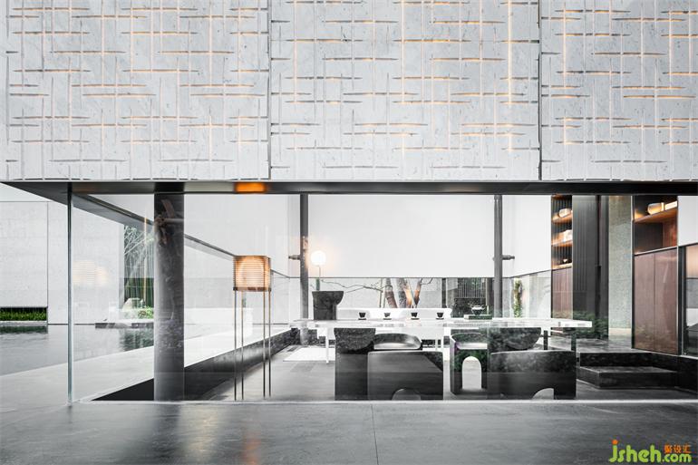 步入建筑,迎接我們的是一場典型的東方體驗,“藝術展廳”奠定了整體一層的空間命題。南京會所設計門廳以精致客廳的面貌傳達強烈的歸屬感,暗示出服務對象的性質。隨著動線轉折,將步調放緩,必經(jīng)路徑上不同的展示內容,沙盤、模型及其他藝術品甚至拾得物皆作為資源融入設計想象,在保持審美統(tǒng)一的前提下層層遞進,為人們到達中心空間的高潮進行鋪墊。南京會所設計建筑表皮垂直方向有韻律的吟唱于展廳空間內部得到了明確的響應,內外體量牢固結合。經(jīng)過反復論證,于?廳中軸線方向增設“覺知亭”與其隔水相望,以一個“點”將空間構圖錨固。