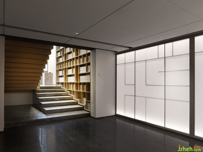 通往半地下一層空間被劃分成開敞式廚房與就餐區(qū),食客與制作者的關(guān)系應(yīng)是互為賞識(shí)的,前提是保有距離,一種互通并不斷保持變化的遠(yuǎn)近關(guān)系,黑色條形鋼板制作的區(qū)間分割面,被設(shè)計(jì)者稱之為“空間面紗”的序列,在食客行走的過(guò)程中,視線不斷被放大,從而發(fā)現(xiàn)食物被制作的過(guò)程當(dāng)是欣喜?!坝X(jué)知”此刻表現(xiàn)為互賞者的心理交流。餐廳設(shè)計(jì)就餐區(qū)的臨窗立面,開窗雜亂之際光的肆意,用宣紙材質(zhì)裱糊出的屏風(fēng)墻,將自然光線進(jìn)行二次過(guò)濾,暈染出糯白的儒雅氣氛,黑與白的沖突美學(xué),一如“面紗”的正反面。