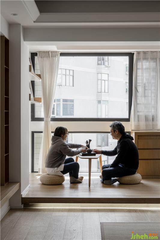 原休閑陽臺納入客廳,抬高一步嵌入燈帶,形成相對獨立卻又融合的第三空間。這里是平時Y女士他們喝茶、健身地方。