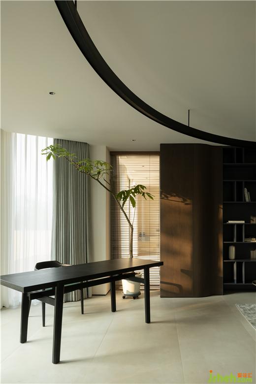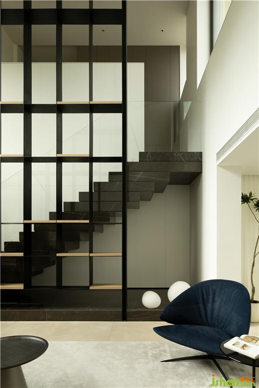 更多的光照了進(jìn)來(lái),層高也變得模糊。倒拱形吊頂下,鏤空的黑色裝飾架縱向延伸,通向一層的樓梯隱藏在其后,作為地下與一層連接通道轉(zhuǎn)化的過(guò)渡,是地下會(huì)客廳的視覺(jué)中心。鏤空的設(shè)計(jì)從地面直達(dá)頂面,木制層板橫向錯(cuò)落,以強(qiáng)烈的比例關(guān)系凸顯大空間尺度,將空間的對(duì)外公共性過(guò)渡至向內(nèi)的私密性。