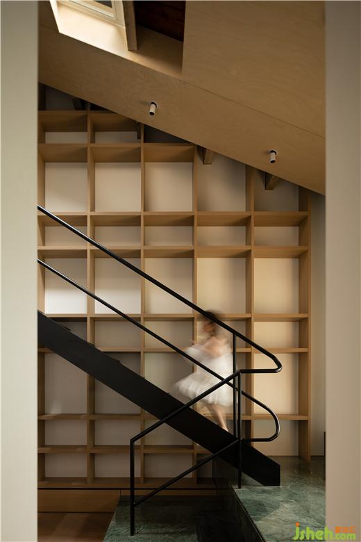 沿著雙坡屋頂?shù)慕Y(jié)構(gòu)做吊頂,是四周留槽的懸空吊頂樣式,在原本天窗處鏤空保留來自頂部的采光。隨著光一起傾泄而下的還有整面的書架墻,顏色素凈結(jié)構(gòu)分明,鋼架結(jié)構(gòu)的樓梯斜著穿插其間,更輕盈通透的建立起樓上樓下連接。