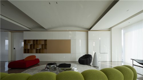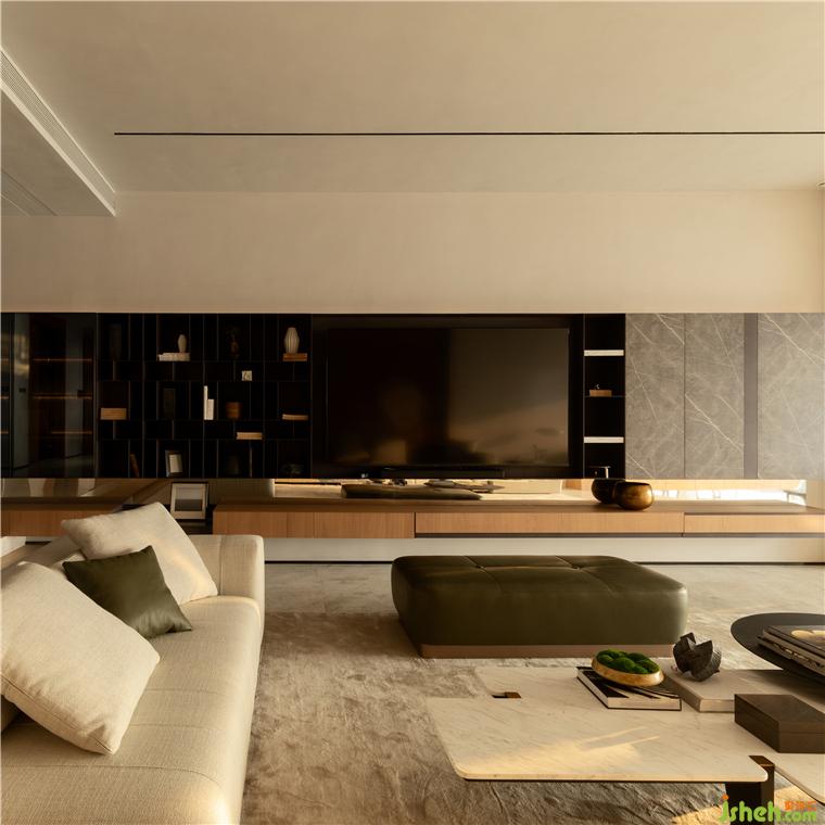 豪宅設計通過關(guān)懷性的設計在客廳建立新的系統(tǒng)和結(jié)構(gòu),從功能拓展出發(fā),水吧作為客廳和陽臺之間的功能過渡,也同時服務于兩者,墻面從木色錯拼格柵開始,豎向的韻律感漸隱至米白色石材之后,減少形式降低變化,將空間提純與漫漫江景相接。