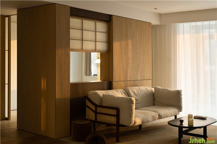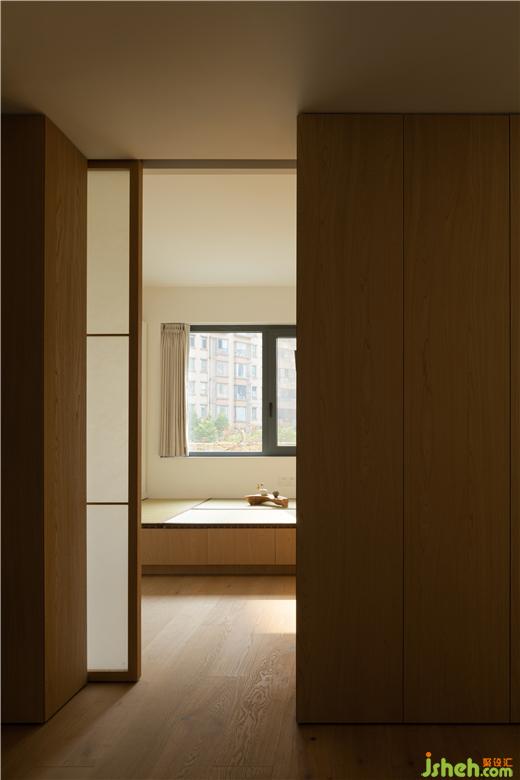 窗扇的開啟用了上下推拉的形式,使空間看起來更加通透,又不失隱秘性,格條和夾了和紙的玻璃,家裝設計營造出日式風格的佗寂,清幽之感,也暈染了一定的禪意氛圍。