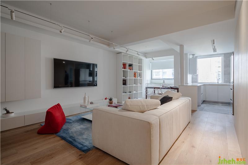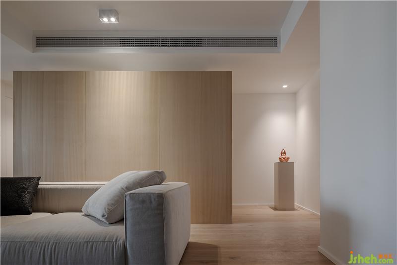 1、原客廳面積較大,傳統(tǒng)能動的墻體全部進行了拆除。拆除過后為避免入戶的空洞和“直接”感,進門處設(shè)置一組柜子扮演類似玄關(guān)的緩沖角色,柜子選用輕盈溫和的淺木色系,它的存在對大空間而言是一種微妙的分割,這種分割并不破碎而是刻意且有序,令整體有了更漂亮的層次感和延伸性,同時還具有嚴(yán)謹(jǐn)?shù)墓δ茏饔茫簭母叨壬峡矗褡禹斆媾c墻面之間預(yù)留30公分的距離,弱化整墻給人的橫亙感和阻撓意味;裝修設(shè)計從長度上看,柜子長度被控制在整條通道的黃金分割點上,往右可以繞過柜子就近來到客衛(wèi)、廚房和客廳,往左則就近到達(dá)書房、小孩房和主臥。(往左方向的過道相對較長,因此盡頭設(shè)立一個端景裝置,令空間更加生動。)