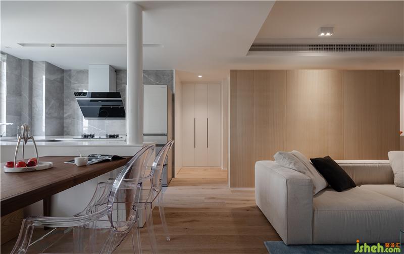2、這套房子建筑面積為135㎡,盡管因為層高與戶型的緣故,實際得房率并不算高,但其內(nèi)部裝修標(biāo)準(zhǔn)卻足以與大型別墅公寓比肩,中央空間、新風(fēng)、凈水等系統(tǒng)兼?zhèn)?,因此空間可以說每寸必爭。走過玄關(guān),品承設(shè)計團隊在客衛(wèi)區(qū)域依然將空間利用率提升至最大化,客衛(wèi)墻角一組柜子將凈化水等設(shè)備隱藏起來,同時上面可做收納,下面可為儲存,視覺上干凈清爽,功能上豐富實用。