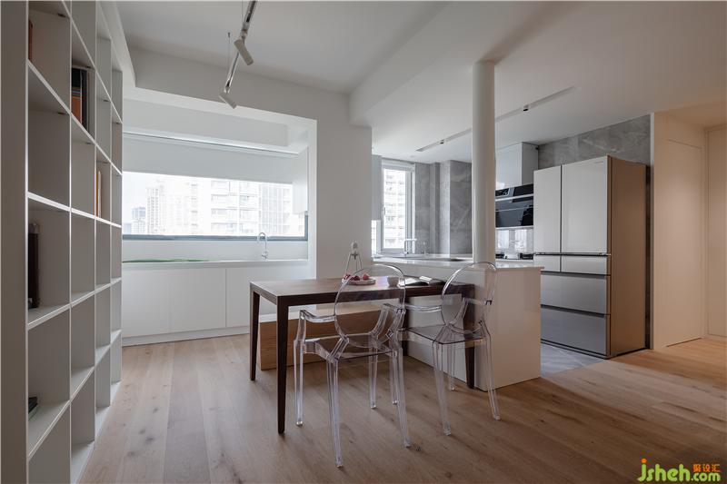 3、廚房采用完全敞開式的設(shè)計,櫥柜在加長延伸出來以后,既是櫥柜也是和餐廳相連接的導(dǎo)臺,滿足作為過渡區(qū)、西餐區(qū)、吧臺區(qū)等多重又復(fù)雜的使用需求。其中,矗立柜面上的圓管為生活排水所用,無法人為移改,品承設(shè)計團隊在對其處理上使用了偏建筑的手法,尊重它的既有存在,但對管子進行精致的外部包裹,從而讓它本身成為建筑構(gòu)架的一部分。