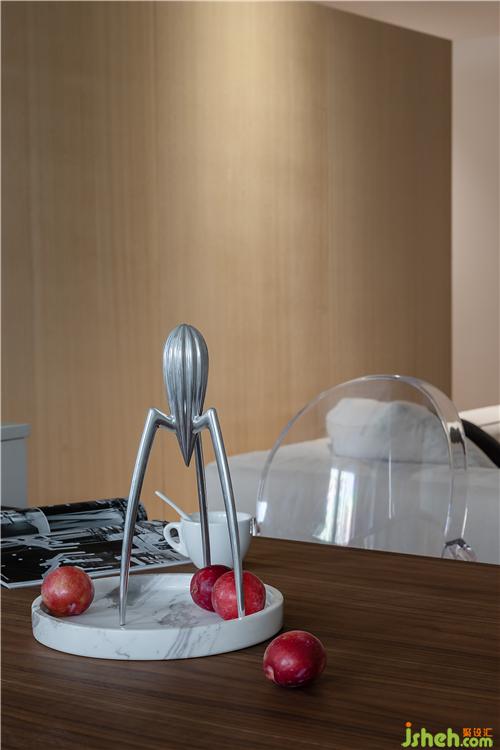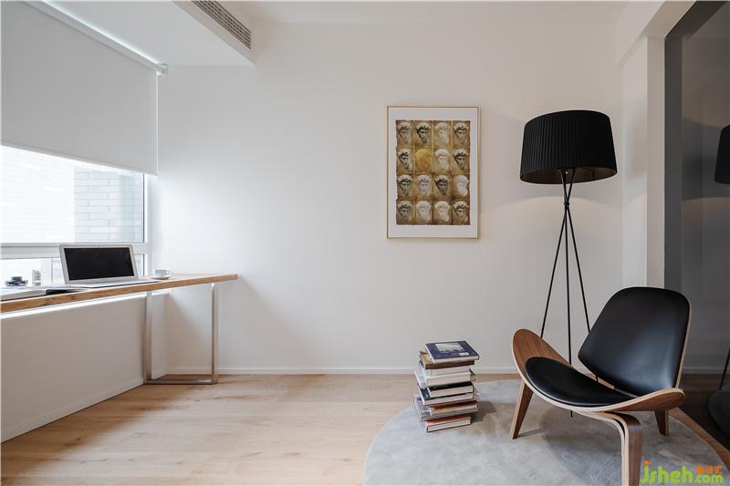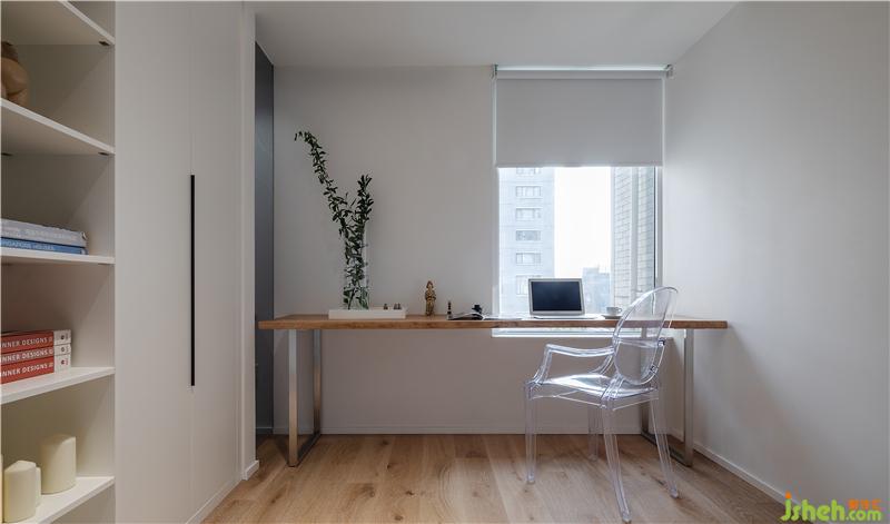 6、品承設(shè)計(jì)團(tuán)隊(duì)認(rèn)為,書房是一個(gè)家里文化氣息的中心,應(yīng)該被最大限度地展示,因此書房同樣采用偏敞開式設(shè)計(jì)。裝修設(shè)計(jì)兩面大玻璃窗,一面對客廳區(qū)域進(jìn)行日光的輸出與補(bǔ)充,一面對主臥形成造景和連通。除了閱讀,這里也是工作、喝咖啡的休閑空間,定制實(shí)木書桌貼著朝南窗戶而立,充沛的光線將滿室熏染得明亮而柔和,臺(tái)燈則彌補(bǔ)了夜晚的照明需要。以后家中如果真的添了小二,這里就可以通過最低成本的改動(dòng)變?yōu)槎⒎快`活使用。