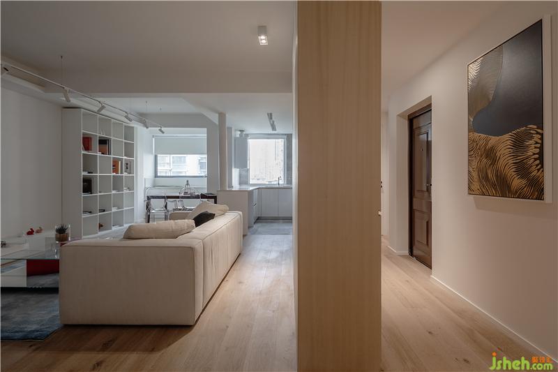 5、餐廳靠墻做了一排陳列架,用于存放家中書籍以及屋主國內(nèi)外旅游淘回來的紀(jì)念品等??蛷d電視背景墻保持留白,底下電視機(jī)柜盡量做到最長用于儲(chǔ)物,左邊定制三門懸柜,不僅平衡空間關(guān)系,也增加收納空間。
