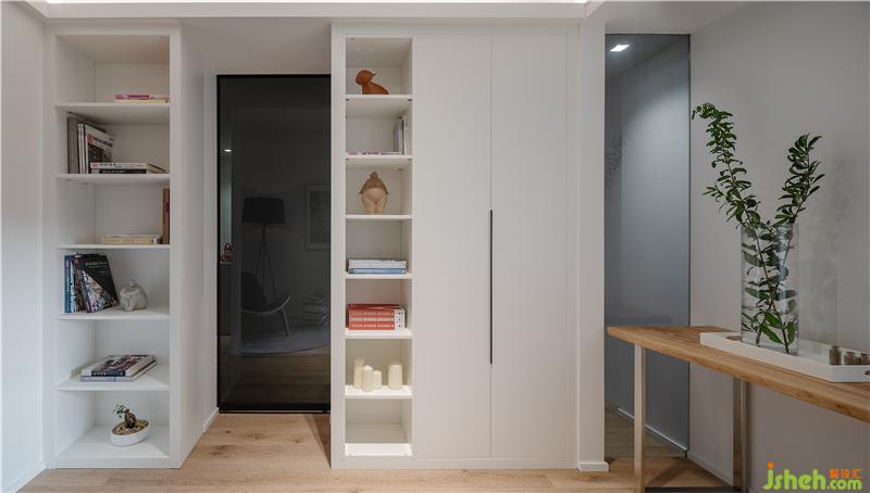 7、主臥室放置一副體量很大的太空宇航服畫面,看似和整個(gè)空間沒有關(guān)系,卻充滿另類裝飾意味,與寧靜素雅的臥室背景形成一種碰撞和對話。主臥原有布局較為傳統(tǒng),進(jìn)門正對衛(wèi)生間,品承團(tuán)隊(duì)將之前的進(jìn)戶門進(jìn)行改動(dòng),在不大的衛(wèi)生間里分離出臺(tái)盆、淋浴間、馬桶區(qū),并利用一面不透玻璃和一面鏡面夾交成的1.2公分厚的隔斷墻,隔出一個(gè)獨(dú)立的L型的小衣帽,鏡面反射讓衣帽間顯得寬敞很多。