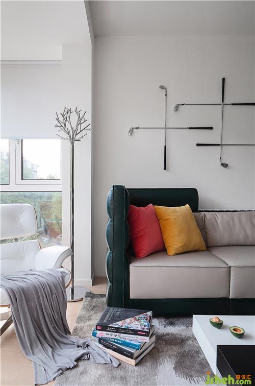 沙發(fā)背景墻有意保持潔凈,八根高爾夫球桿被用透明魚線以不同的排列組合方式懸吊固定,成為整個客廳的裝置背景,實際效果十分驚艷。魚線的使用不露聲色,而且對球桿和墻面的破壞很小,設(shè)計之用心自細(xì)微處可見。
