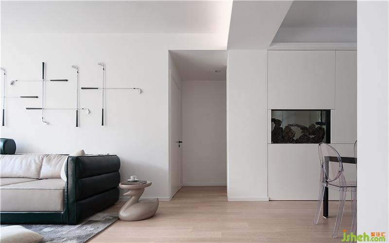 前文提到傅先生養(yǎng)魚的愛好,但市面上大都是柜式魚缸,空間占比大且很難和空間匹配形成良好對話。考慮到原本過道與餐廳之間的尷尬局面(按原戶型,無論從北房間還是南房間出來往客廳走,一出來看到的就是餐桌),索性將過道封掉做成魚缸,同時從兒童房里切出一個不影響整體的1.5㎡的角,變成公共過道區(qū)。