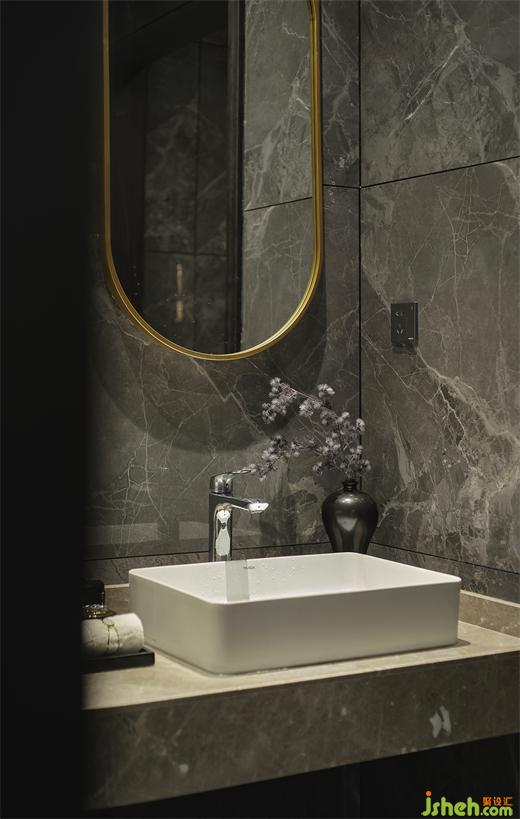 衛(wèi)生間采用大理石與金屬的冷暖對比凸顯雅致,陶瓷花瓶配以低垂的松柏,迎接著客人的到來,整體氛圍低調(diào)內(nèi)斂。