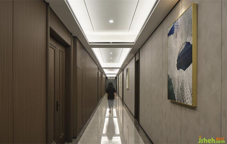 走廊延續(xù)辦公區(qū)裝修風(fēng)格,商務(wù)辦公樓設(shè)計(jì)空間簡潔秩序,深色木紋和淺色墻板,形成鮮明對比,豐富了空間層次感。