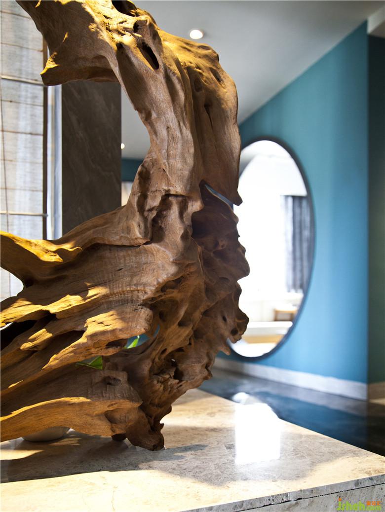 因為對老物件的情有獨鐘,幾扇老門窗通過現(xiàn)代設(shè)計手法賦予其新的使命,斑駁帶有歲月痕跡的老水缸、殘缺的小石磨、質(zhì)樸的朽木根、生機盎然的小綠植......古今碰撞,禪意漸濃。