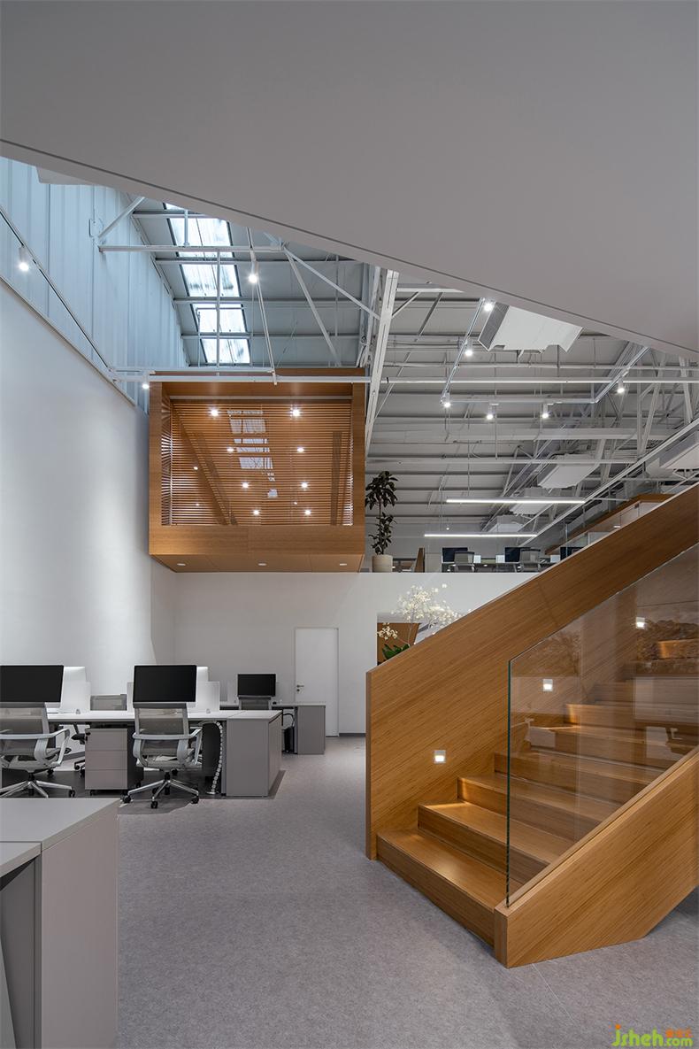 在二層置入兩個木色盒子,提供一個讓建筑、人與自然交互的接觸面。辦公室設(shè)計一個盒子平行于建筑面寬,提升顏值充當(dāng)陽臺;另一個盒子與之垂直,獨立存在于室內(nèi)空間,通過倆端的開窗聯(lián)通室內(nèi)外,形成自然和室內(nèi)的對話,用于分享靈感和溝通討論。