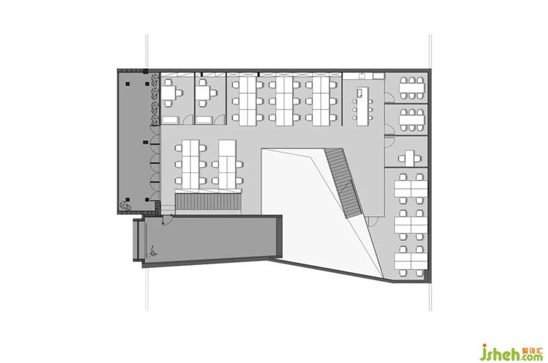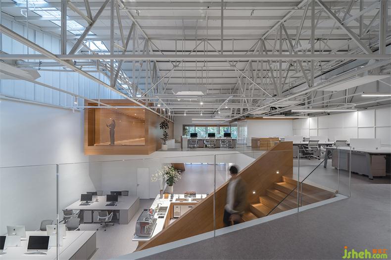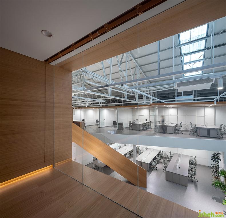 普悅設(shè)計將樓梯以空間裝置的形式嵌入進(jìn)來。一組置于回形吧臺后,辦公室設(shè)計裊裊升起的茶香,沿著樓梯向上升騰;另一組置于一樓入口右側(cè),提供高效的空間動線。兩組樓梯與研發(fā)吧臺互相呼應(yīng),形成視覺上的整體。