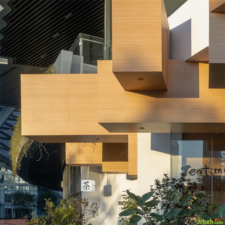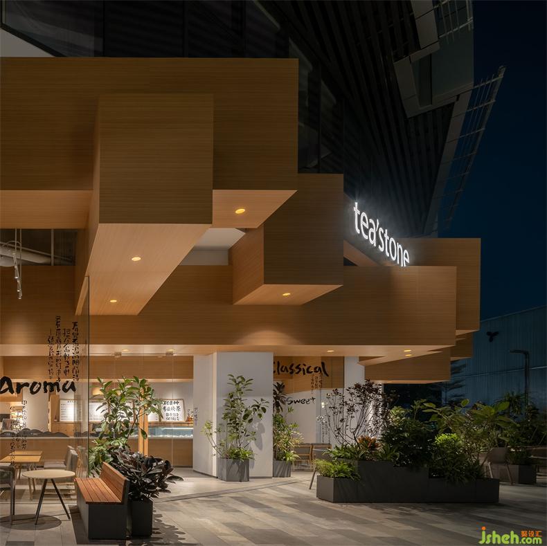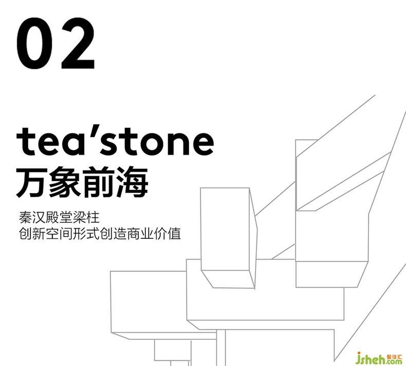 萬象前海是tea'stone在深圳的第5家門店。室內(nèi)設計師店鋪位于商場一層最東側的入口廣場位置,這是可資利用的資源。建筑外立面為弧形幕墻,氣質(zhì)上不太符合品牌調(diào)性;左側上方的挑臺侵入商鋪門頭招展面,于設計而言,是很大的不利因素。