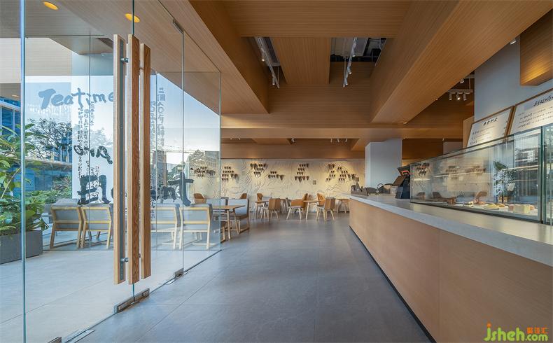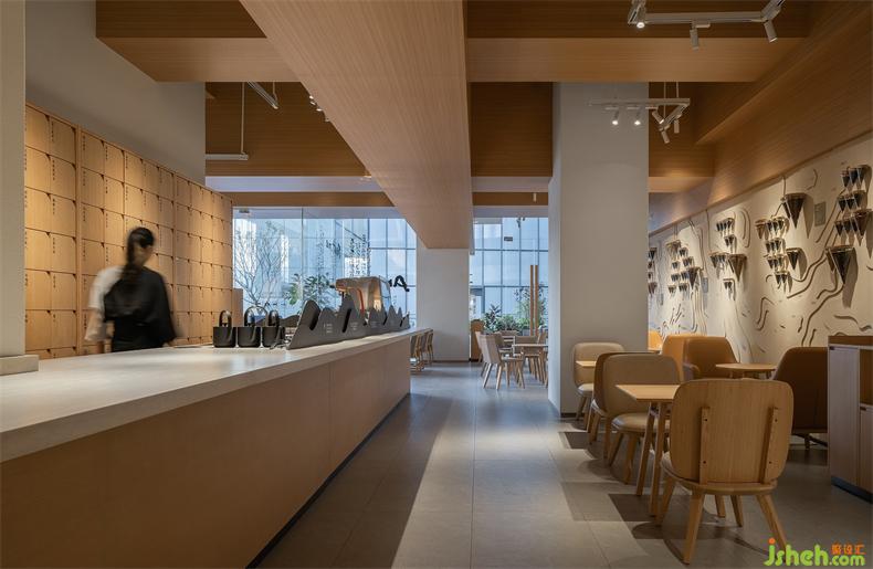 吧臺(tái)仍然是空間的重心,山形擺件形成獨(dú)特的吧臺(tái)景觀,與對(duì)面“茶色大地”裝置墻形成整體,集合中國茶山人文地理、茶樣及風(fēng)土樣本,品牌方用裝置藝術(shù)化的語言表達(dá)出當(dāng)代中國茶的博大精深。