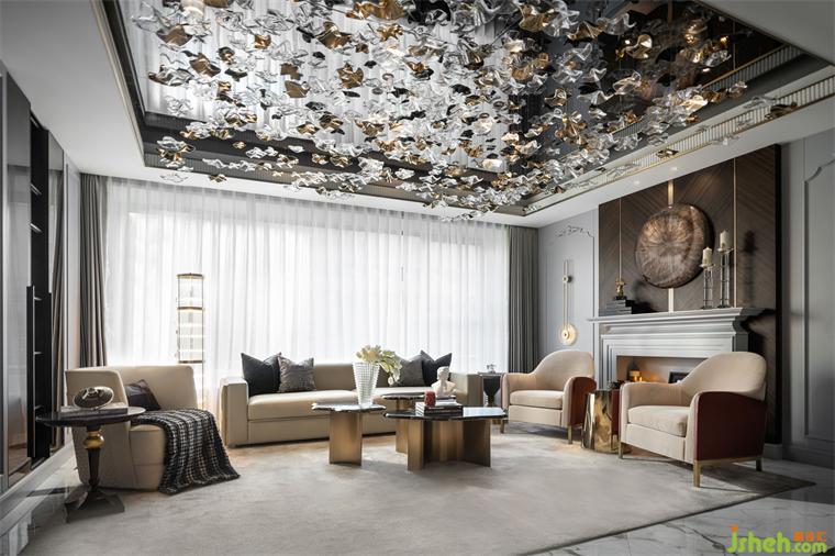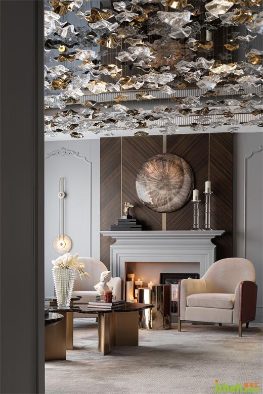 起居空間頂面以灰鏡擬態(tài)蒼穹玄夜,懸以水晶,如垂列星、如水漣漪、璀璨晶瑩、光映微庭。世事庸擾間,信仰的蒼穹仍然閃耀,仍然承載著自由、創(chuàng)造、以及某種幸福的形象,樣板房設(shè)計(jì)將一種意料之外的視覺(jué)刻畫(huà)與理性之美,結(jié)合地很好。