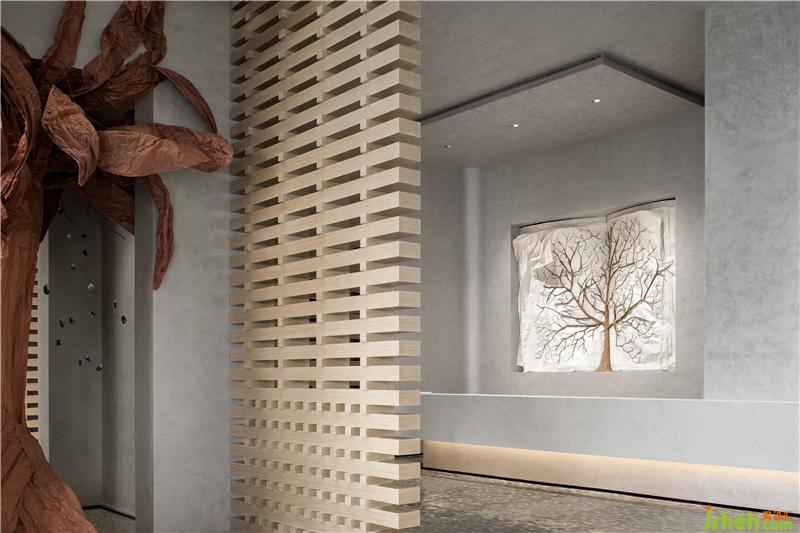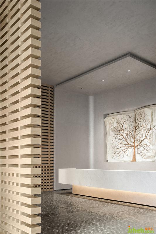 動(dòng)線劃分功能、引導(dǎo)路徑,在體量不大的售樓處,動(dòng)線設(shè)計(jì)還須處理開放與私密、親近感與距離感的平衡問題,以及更重要的,基于以人為度量的尺度問題。不同的尺度引發(fā)不同的情感認(rèn)知,而本案的尺度在于微妙的住宅居所尺度熟悉感,柒點(diǎn)設(shè)計(jì)為本案量身定制設(shè)計(jì)的大型木質(zhì)格柵的系統(tǒng)應(yīng)用成為解決方案。