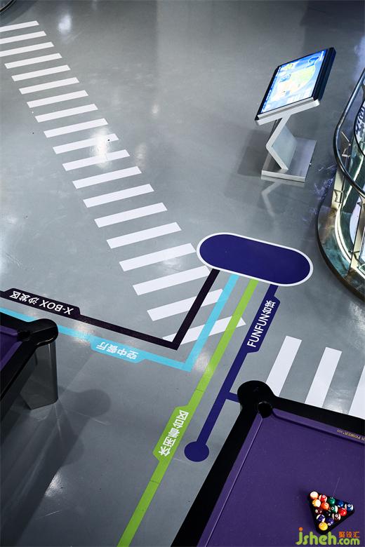 保齡球場大面積地使用涼爽的藍色和紫色線霓虹燈,使空間更富有電子科技感。The bowling alley uses cool blue and purple line neon lights in a large area, making the space more electronic and technological.