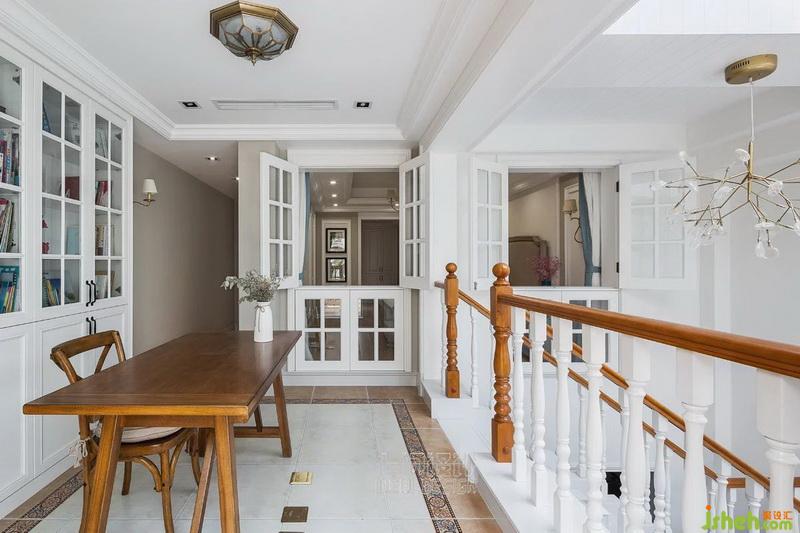 二樓樓梯正對的位置,設(shè)計公司利用起來做成開放式書房,這里有良好的采光和絕佳的視野,無論在這里處理工作,還是靜下心來讀寫,都很加分。