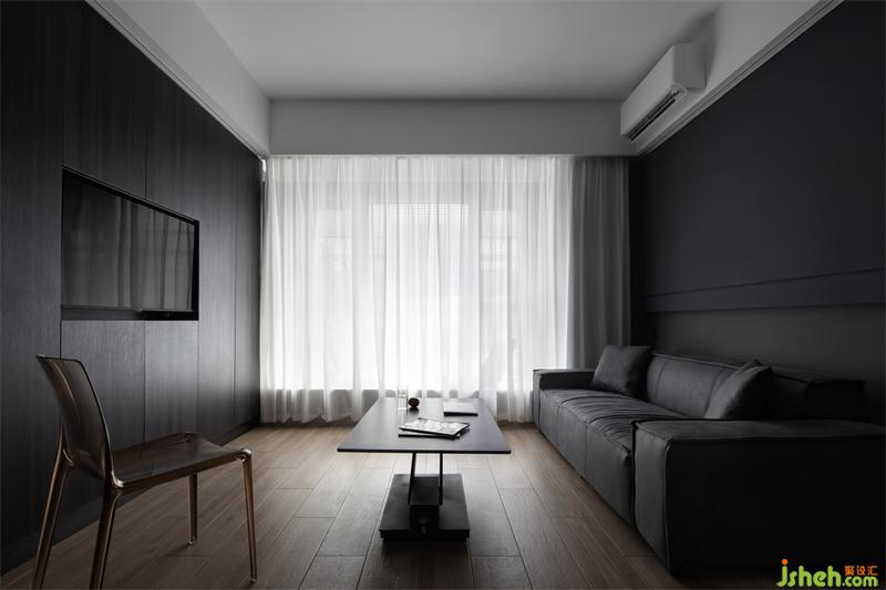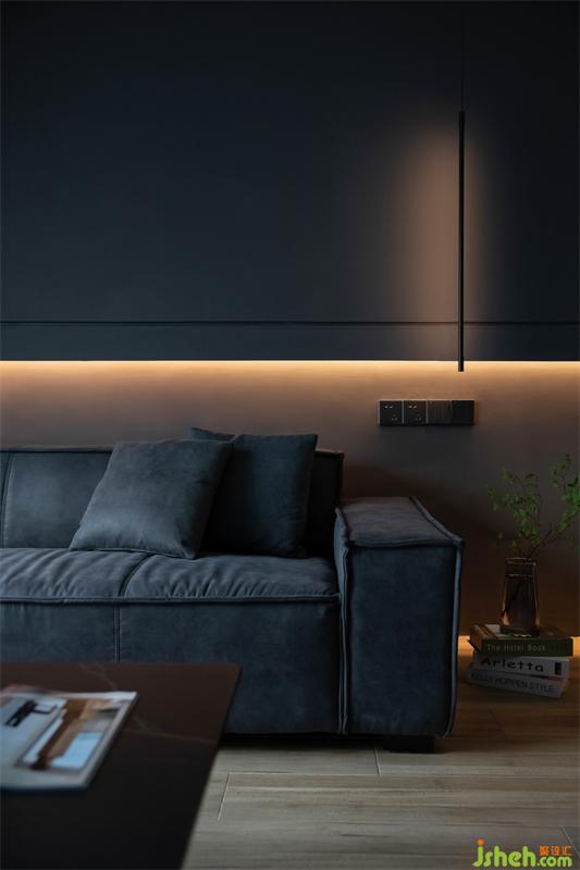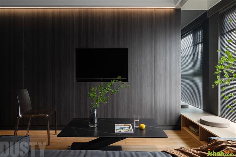 設(shè)計師希望空間是干凈整潔的,電視機(jī)是黑色的所以組合柜全部采用深色,深色沙發(fā)是我想要的,后面的造型也刷成了深灰色,考慮到是居住空間,地面設(shè)計了原木色木紋磚,這樣空間不會那么壓抑。