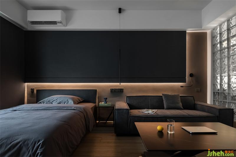 公寓設(shè)計為了背景燈光氛圍效果的呈現(xiàn)的同時還把兩個家具聯(lián)系起來,床頭和沙發(fā)背景墻設(shè)計了一組懸空造型板,使得看上去更加的整體。