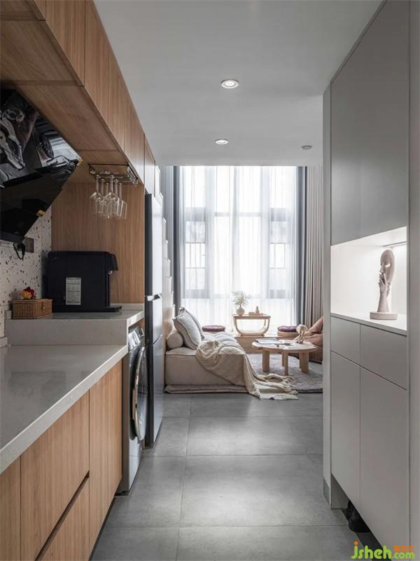 進(jìn)門左邊我設(shè)計(jì)了櫥柜樓梯下方儲物柜,甚至吊柜也是做的一樣深度,看上去簡潔干凈,極簡風(fēng)格最重要的就是收納。