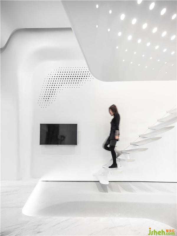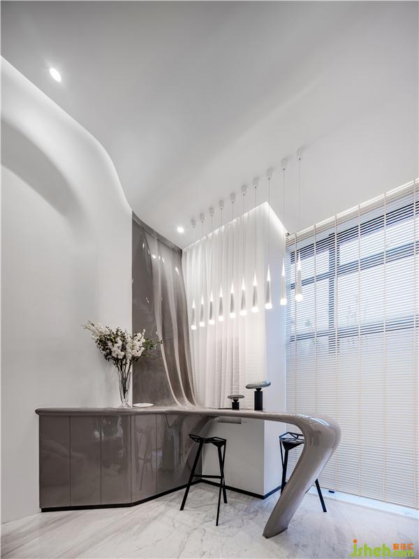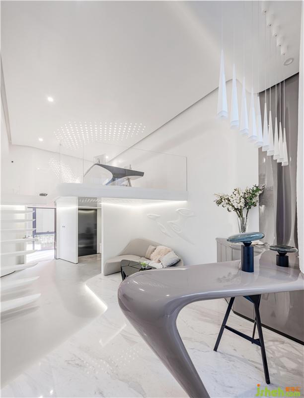 LOFT樣板間運(yùn)用扎哈的異形造型營(yíng)造時(shí)尚、品質(zhì)的超現(xiàn)代生活意境,實(shí)現(xiàn)了小戶型里的豪宅夢(mèng)。連接夾層的“魚骨樓梯”和“流水瀑布吧臺(tái)”是本案的亮點(diǎn),藏山水之美,于一室之中,一體成型的雕塑感造型,增加了空間的藝術(shù)氣質(zhì)。室內(nèi)設(shè)計(jì)師