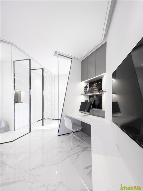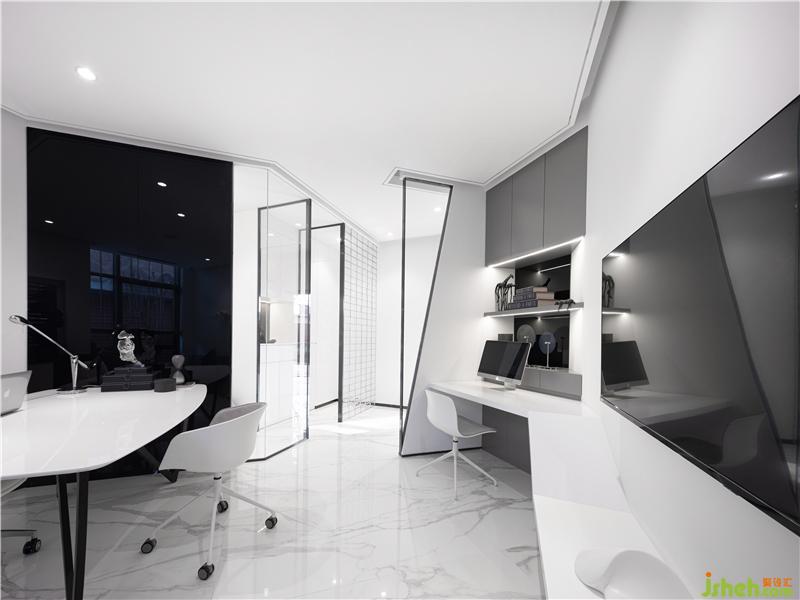 本案有兩種風(fēng)格的樣板間,分別是扎哈風(fēng)格的LOFT樣板間和現(xiàn)代主義風(fēng)格的辦公樣板間。兩個(gè)樣板間在空間意境上追求的都是高品質(zhì)的辦公+生活??臻g以純白色調(diào)為基調(diào),增強(qiáng)空間的結(jié)構(gòu)感和秩序感。局部穿插灰色和黑色高反光材質(zhì),增加空間的品質(zhì)感和時(shí)尚感。