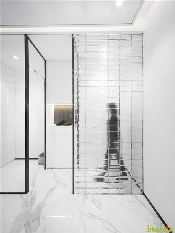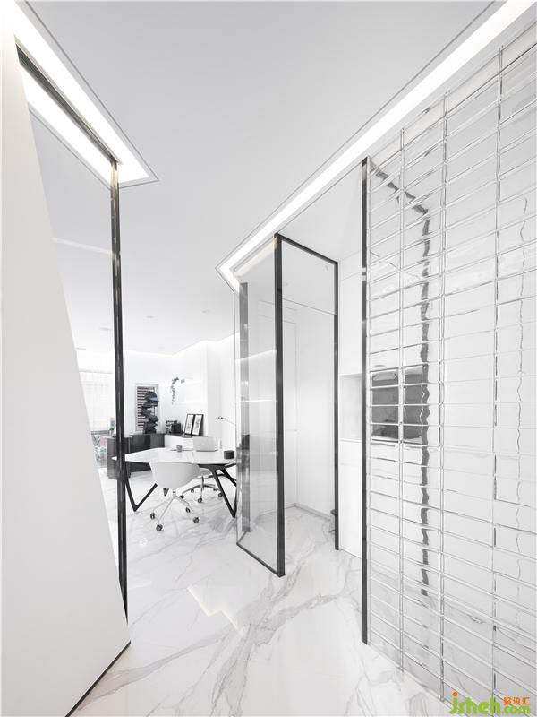 辦公樣板間運(yùn)用了現(xiàn)代構(gòu)圖的方式,突破傳統(tǒng),通過立體幾何營(yíng)造時(shí)尚、品質(zhì)、靈活的居家辦公場(chǎng)景。空間材質(zhì)運(yùn)用仿魚肚白的大片地磚、熱熔玻璃磚、黑鏡、灰色烤漆板,呈現(xiàn)光反射、折射的虛境空間,增加空間的品質(zhì)和光感。室內(nèi)設(shè)計(jì)師