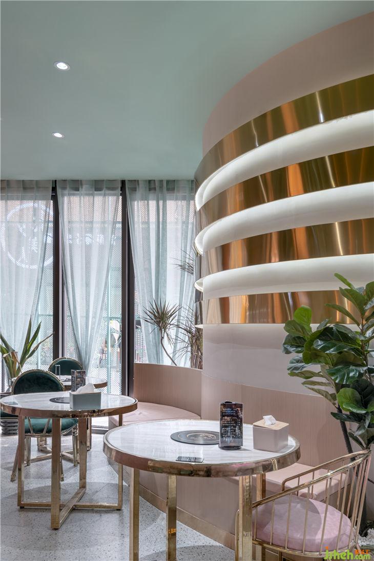 靠窗卡座區(qū)曲線吊頂與花瓣燈具的結合,體現(xiàn)女性的柔美和花夕美人的意境