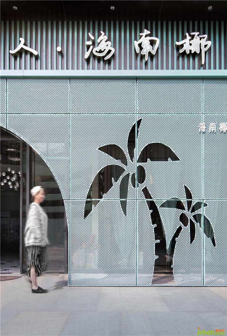 薄荷綠沖孔鋁單板結合椰子樹以及拱門造型增加入口的標志性