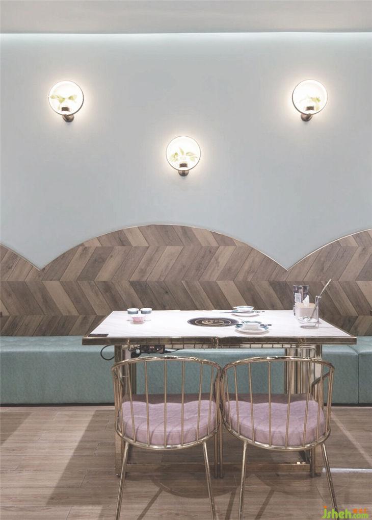 餐廳幾何形的定制燈具和墻面造型增加現(xiàn)代和變化的葉片抽象元素,薄荷綠與裸粉色的搭配符合椰子雞定位的女性客戶需求以及花夕美人的意向情景