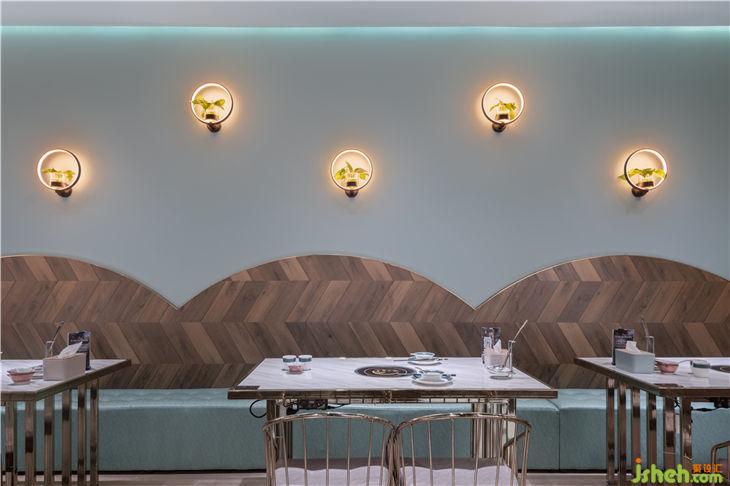 靠墻卡座區(qū)半弧形的靠背造型與墻面變化的壁燈結合,錯落變化營造溫馨的就餐氛圍