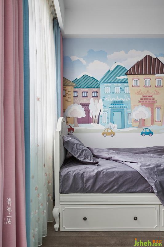 ▲臥室地面工字鋪貼木地板,空間上使用點(diǎn)光源式筒燈和床頭吊燈,KD板+壁紙做為床頭背景墻,吊頂用金色不銹鋼做走邊,墻上淺亞麻色壁紙過(guò)渡到香芋紫床品,搭配黃色窗簾,為臥室注入溫馨的色調(diào),將質(zhì)感與簡(jiǎn)約延續(xù)。