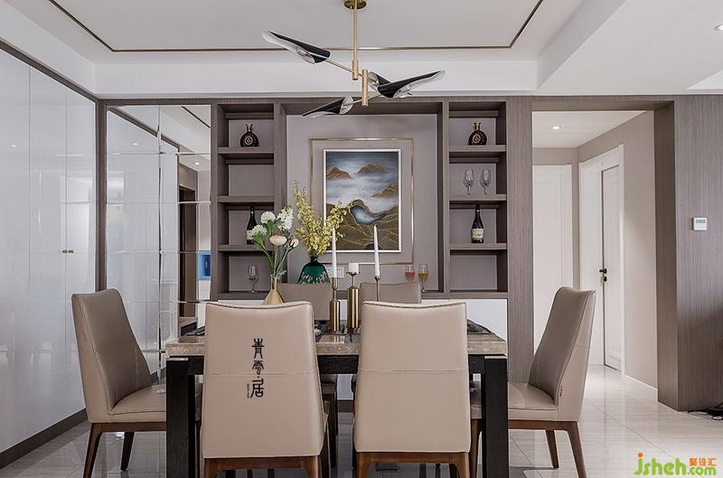 餐邊展示柜設(shè)計公司沿用了客廳的主題,達到視覺上的統(tǒng)一感,不僅從色彩上營造出和諧感,一旁的鏡面讓餐廳在橫向上有延伸空間的視覺效果。