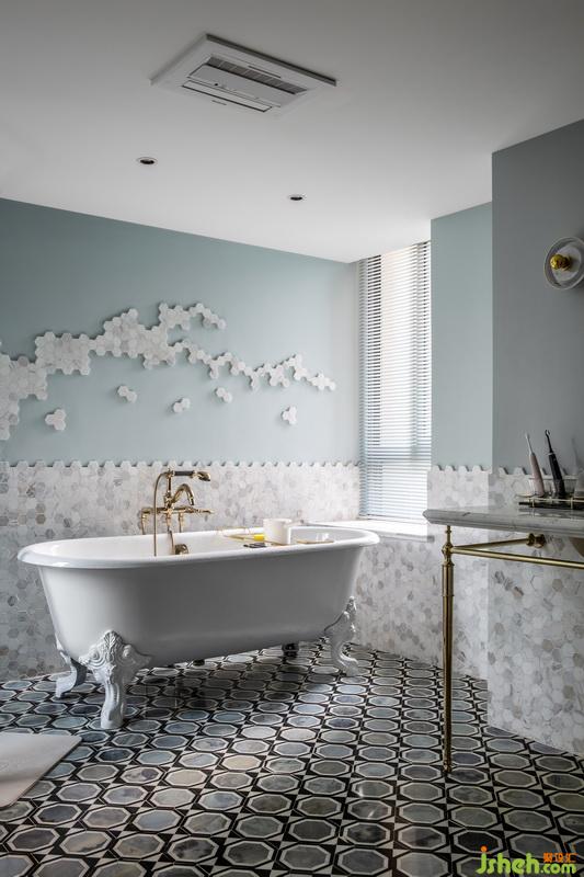 頗具設(shè)計(jì)感的地面彩色瓷磚搶了不少關(guān)注度,墻面則由大理石小瓷磚貼了一半的高度,多余的材料室內(nèi)設(shè)計(jì)師用其擺成雪花的形狀貼上,墻面背景為薄荷綠色乳膠漆,這樣使視覺(jué)上具有層次感,色彩也更加豐富。浴缸支撐腳上雕花具有異域風(fēng),金色衛(wèi)浴在空間里很適合耀眼。在浴缸末端添置一面百葉窗,整體空間即優(yōu)雅也實(shí)用,一切都剛剛好!
