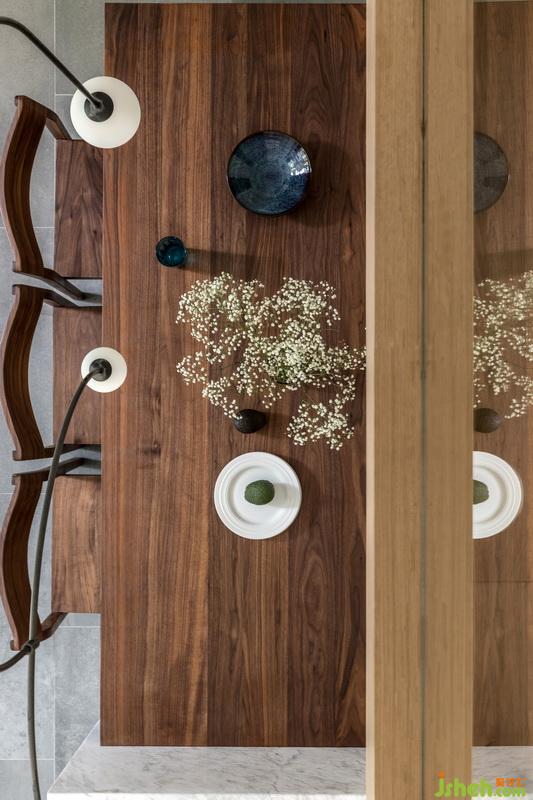 實木家具具有獨特清晰的紋理,散發(fā)著木材特有的香氣和來自森林的自然氣息。注重質(zhì)感的白色大理石吧臺,打破空間,卻又不喧賓奪主,很好的融入其中。