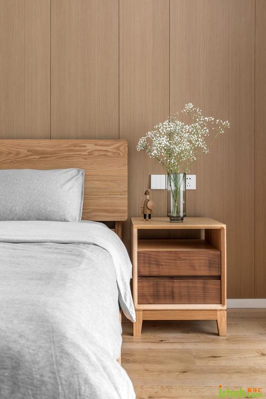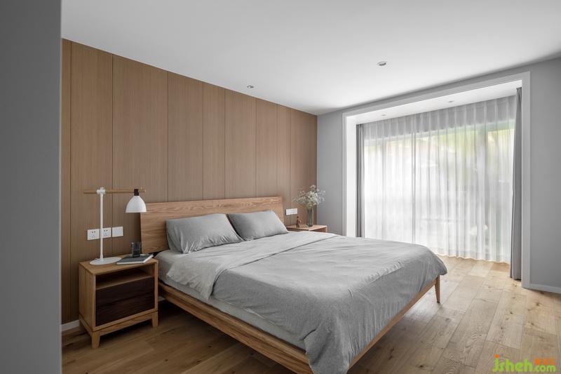 主臥整體色調(diào)比較淡雅,以木色為背景再加上大面積,落地窗的加持一副窗簾隔開室內(nèi)與室外半藏半露之間透出的綠色,很符合我們“家庭與自然”的主題