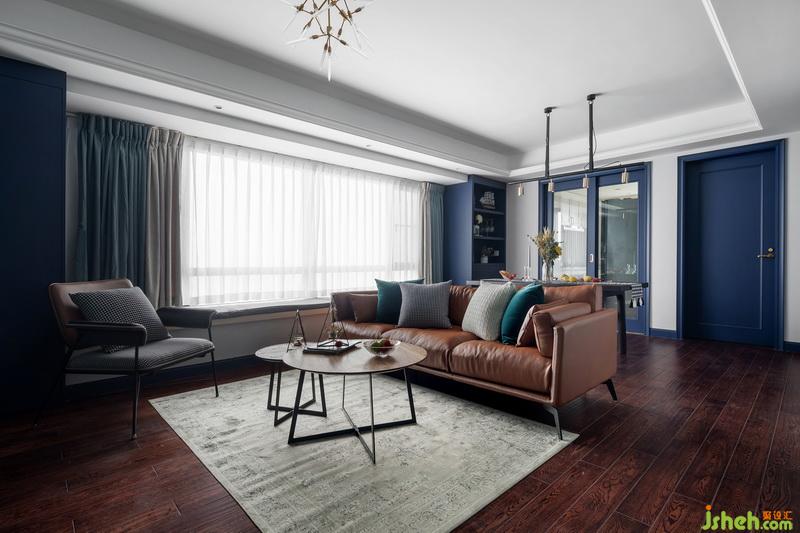 要如何挽救保留紅棕色地板后的壓抑感,設計師重在色彩搭配上面下功夫。使用冷色系如藍色墻面柜體等,形成強烈的視覺對比沖擊,讓我們視覺上移,減少地面對空間造成的壓抑。暖色系如地板沙發(fā)等紅棕色,中間色如黑白色。最后運用這些進行組合,得出一個高色彩對比度的作品。