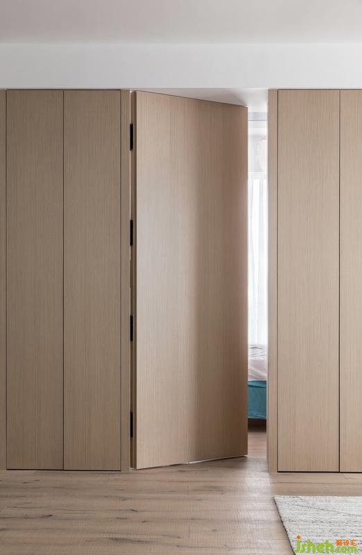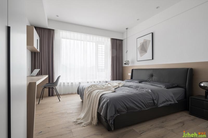 主臥是夫妻倆的私人空間,整個(gè)空間以飽和度較低的色調(diào)為基底,室內(nèi)設(shè)計(jì)師使用大量的木質(zhì)材質(zhì),如地板、桌子與護(hù)墻板,搭配黑色、灰色床與床品,時(shí)尚不失簡(jiǎn)約。大窗戶良好的采光為室內(nèi)營(yíng)造出潔凈溫暖的視覺感受。