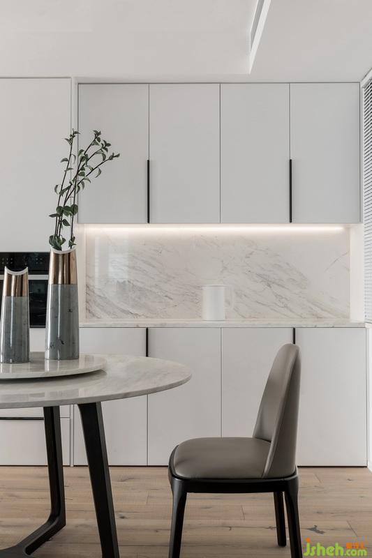 U型廚房,室內(nèi)設(shè)計(jì)師合理的動(dòng)線安排,讓廚房更加人性化。白色櫥柜搭配白色大理石,廚房擁有如此巨大收納量的柜體看上去依然清爽明亮。
